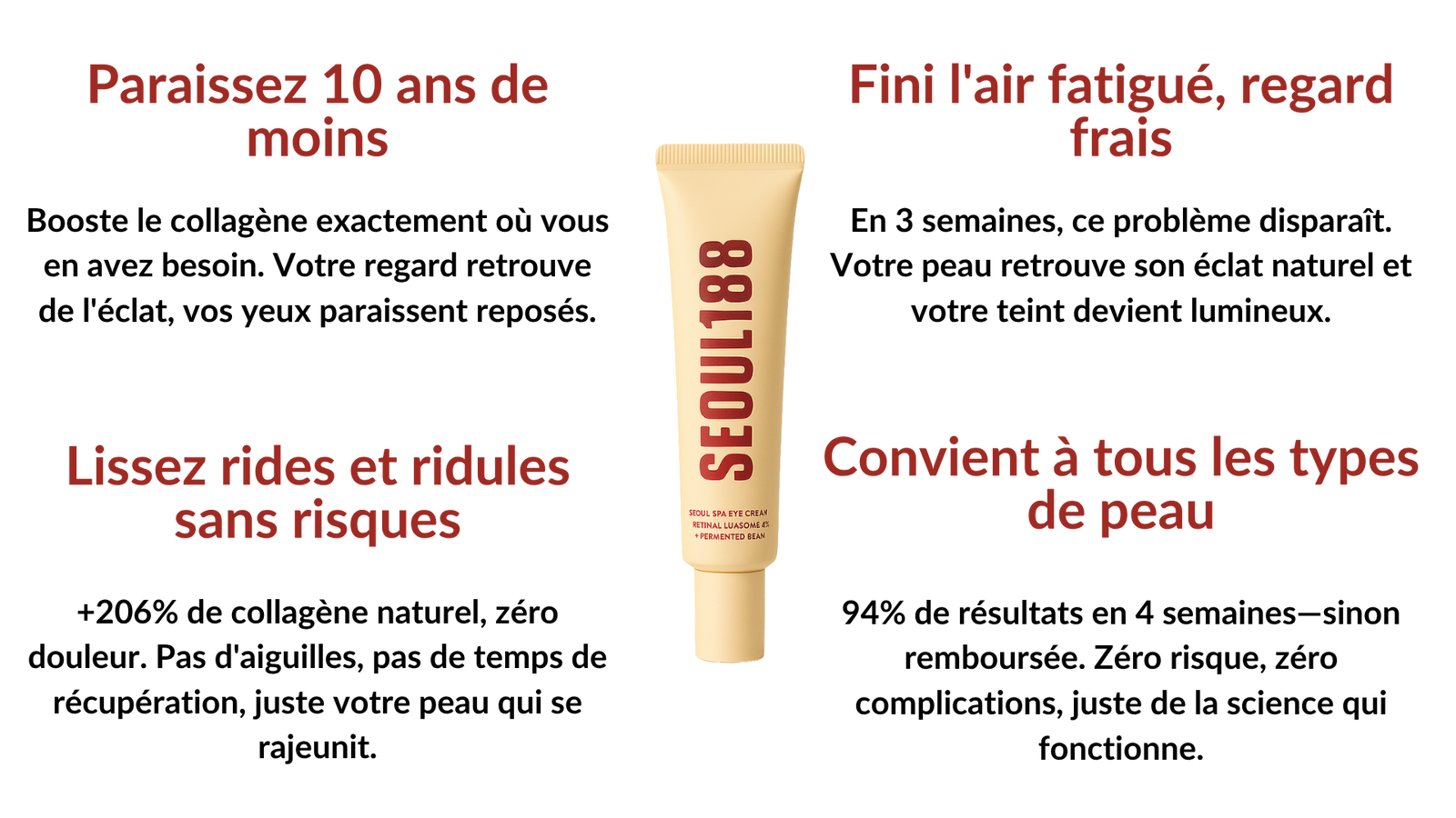Prenez une quantité de la taille d'un grain de riz de Seoul 1988. Appliquez délicatement sur les zones ciblées comme sous les yeux, les pattes d'oie, les ridules et le front.